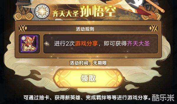 分享的内容是不限制的,随便大家分享什么都是可以的,我们可以通过抽卡来进行分享,也可以调整羁绊来进行分析分享等。总之只要我们满足了两次分享就算是任务完成,就可以免费领取到齐天大圣孙悟空了,还是非常简单的,大家一定不要错过啦。