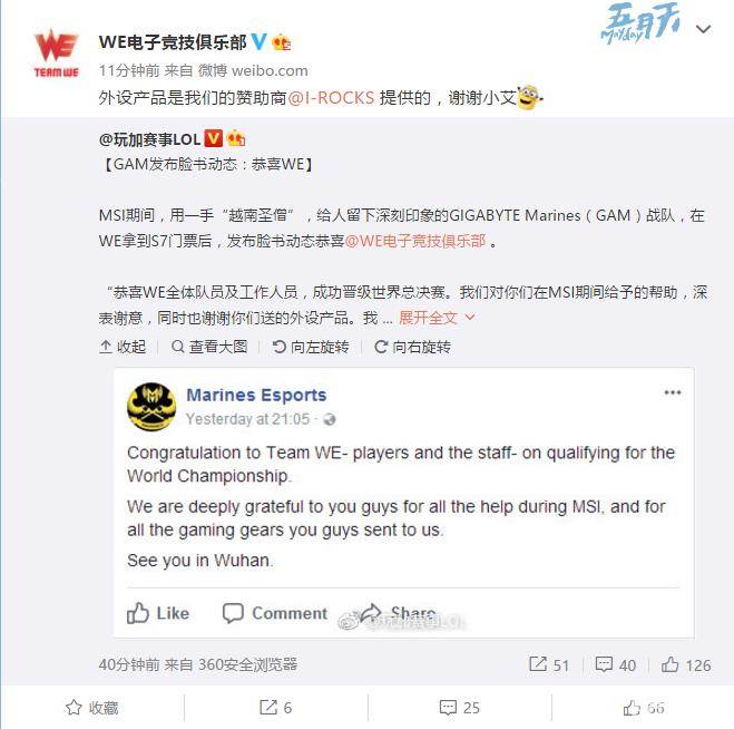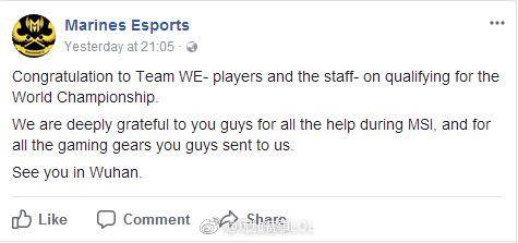 “恭喜WE全体队员及工作人员,成功晋级世界总决赛。我们对你们在MSI期间给予的帮助,深表谢意,同时也谢谢你们送的外设产品。我们武汉见!”