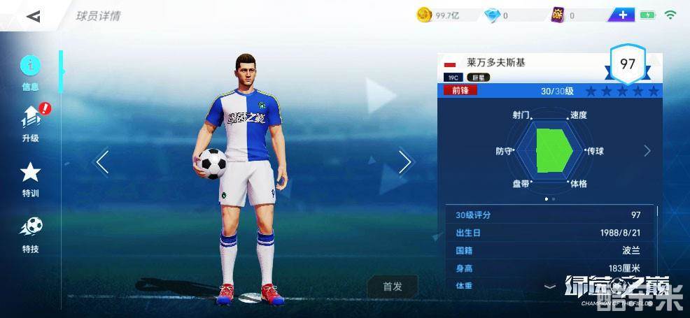 莱万有着锋线全能的能力,是足球场上最优雅的杀手。184的身高,却有着出人意料的身体平衡。在《绿茵之巅》中登场的莱万,位置定位是全能前锋,各项属性虽然不是最顶尖的,却是最平衡的。初始强壮和速度都到达了80+,射门能力方面初始射术91,远射也达到了83,盘带和控球也毫无短板,可以胜任任何阵容和战术。