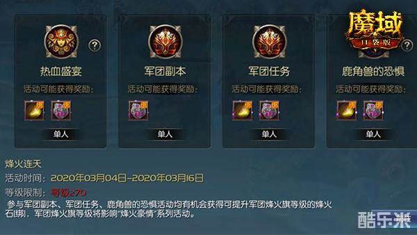 3月4日-3月16日,《魔域口袋版》特别推出“烽火豪情”军团系列活动。在活动期间,参与军团副本、军团任务、鹿角兽的恐惧活动均有机会获得烽火石,随着你获取的烽火石越多,你也将不断为军团烽火旗的提升助力,不仅能帮助军团在本次系列活动中带来增益,还能帮助军团长尽快开启热血军团争霸赛的参与资格!活动期间,《魔域口袋版》同样准备了许多丰厚好礼,只要参加天降豪礼、签到有礼、盛宴谜题和热血盛宴等活动,即可获得大量荣誉军团勋章,前往烽火商城换你所想!