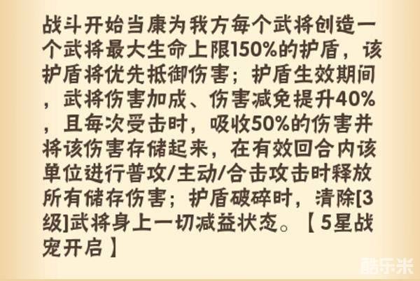 新机制“战宠援护”可算作是武将回合时的额外出手机会,增加一定伤害,并且提供了buff和debuff,可以看做一个效果均衡的偏辅助类技能,能够降低敌方武将的伤害,提升我方的生存能力。