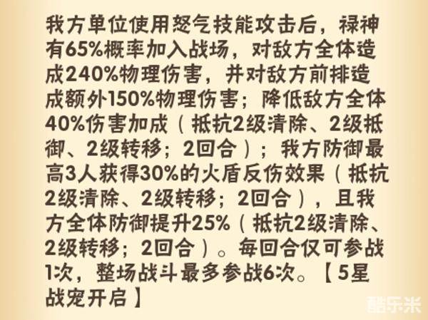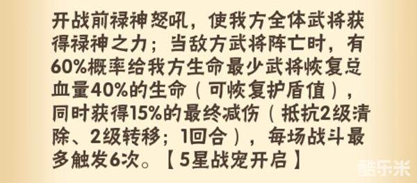 禄神·当康的怒吼技能比暗金战宠加强了很多,不但可以恢复护盾值,而且还有最终减伤buff,清除、转移的抵抗等级也从1级提升到了2级。