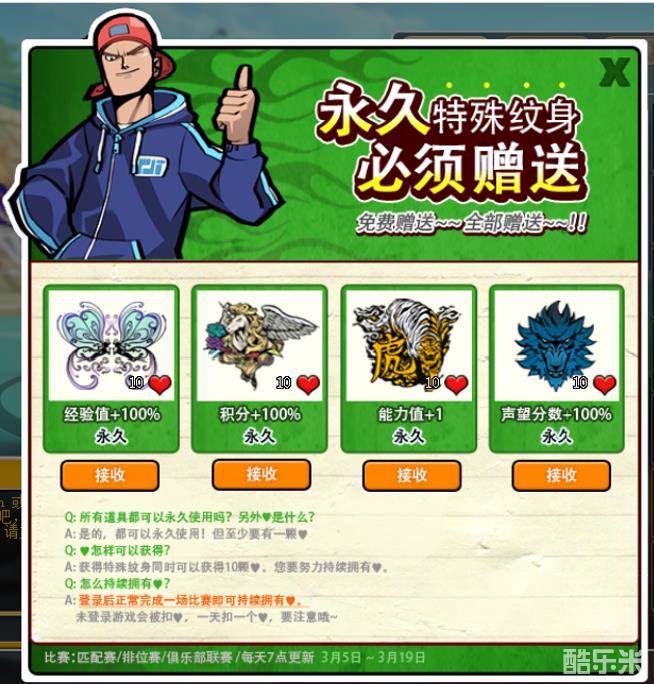活动规则:活动以账号为单位进行。活动期间内可直接在活动界面领取4个永久纹身。带有?的纹身都可以永久使用,但至少要拥有一个?。