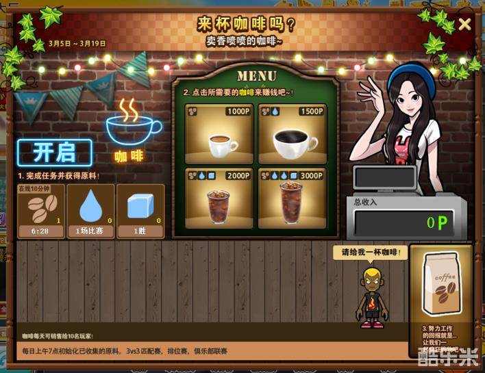 活动规则:完成活动面板中的任务,获得原料。四种咖啡需要不同数量的原料,出售后所带来的收入不同。咖啡每天最多可出售给10名顾客。出售咖啡带来的收入可以兑换多种道具,有永久+1的道具哟。
