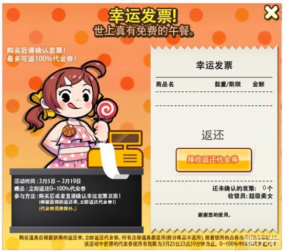 活动规则:玩家购买道具后,根据获得的返还率,立即返还代金券。大部分点券道具都适用(部分商品不适用),根据使用的点券为准(20点券以上),0~100%随机获得返还率。