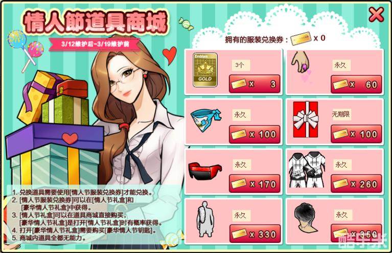 活动规则:情人节礼盒直接在游戏商城中出售。打开情人节礼盒有有概率获得各种稀有道具、炫光道具和新服装。情人节礼盒打开有一定概率获得豪华情人节礼盒。打开情人节礼盒和豪华情人节礼盒有一定概率获得情人节服装兑换券。情人节服装兑换券可以在情人节服装商城中兑换对应道具。
