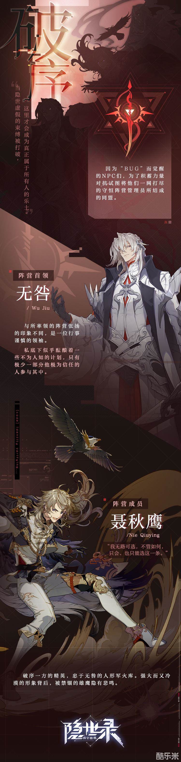 “破序”阵营成员们原本以同盟形式活动,但随着里世界开启,隐世“BUG”加剧,“守恒”阵营开始与其产生冲突。他们以无咎为核心结成了更为紧密的势力,主动发起与“守恒”一方的对抗。