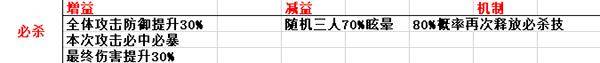 必杀技中再一次增强了自身的攻击和增伤,以及随机三人的眩晕状态,本次攻击也是必中必暴,可怕的是还有百分之八十的概率再触发一次必杀。