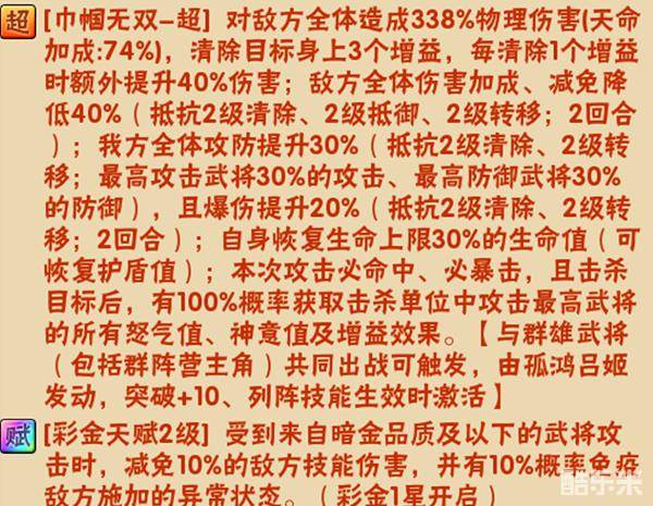 吕姬的超合击技能很强势,其中值得注意的是抵抗2级清除和转移的增益,我方全体攻防加30%,主核额外加30%,爆伤提升20%。而由于清除增益附加的额外伤害是可以清除的,所以最有可能享受这个buff的是战马。彩金天赋对暗金以及以下武将影响还是很大的。
