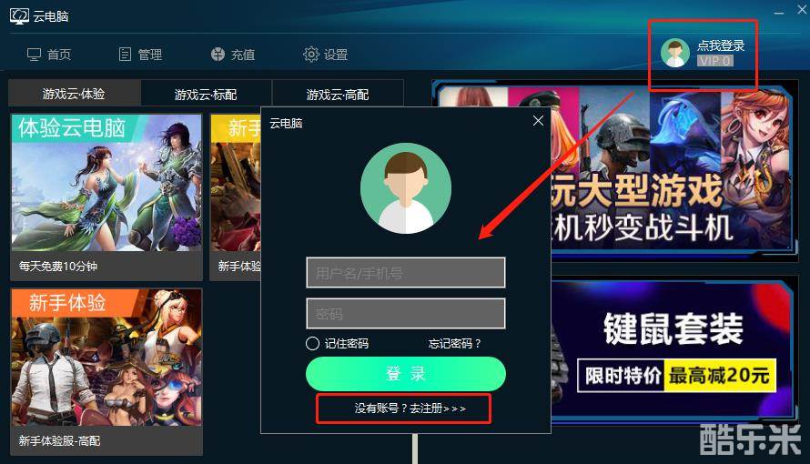 打**云电脑客户端之后,需要登录才能使用,如果已经有账号了那么就直接输入账号登录即可。如果没有账号我们选择**账号进行**。