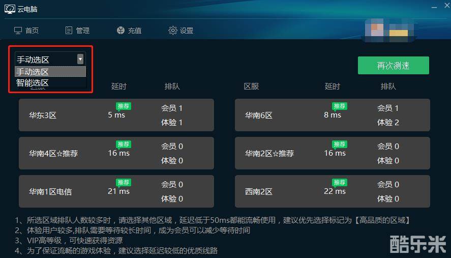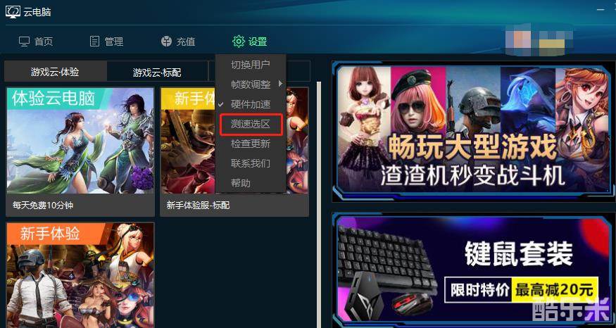 登录后,我们可以进行【测速选区】,这样可以保证云电脑的使用体验。