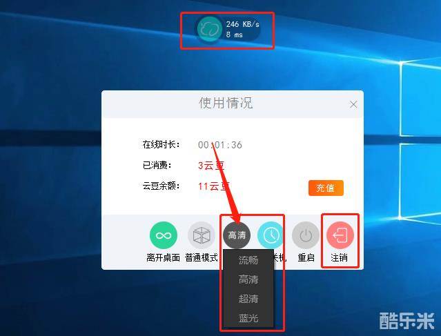 另外,我们还可以点击【悬浮球】进画面的调节。可以选择流畅、高清、超清、蓝光四种画质。如果玩家结束云电脑的使用后可以点击【悬浮球】,点击右下角的【注销】即可退出云电脑。