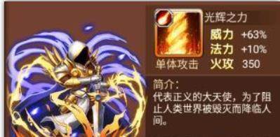 光辉之力(单体攻击):以爱和正义的名义,签下永恒守护的誓约,发出必定可以胜利的一剑。威力+63%,攻击+10%,火攻350。