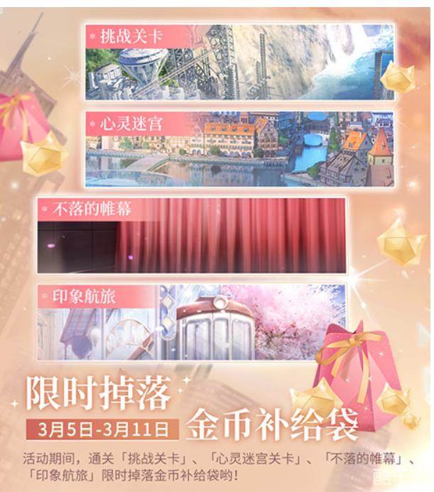 3月5日起至3月11日,玩家们每次通关挑战或心灵迷宫关卡将会收获额外2个金币补给袋,每次通关“不落的帷幕”或“印象旅航”将掉落3个金币补给袋。此外,首次分享活动也将获得10个补给袋。每个补给袋含有一定数量的金币奖励,通过指定关卡即可获得!
