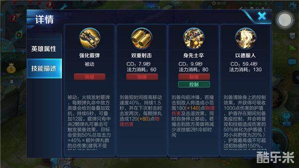 刘备一技能可以瞬间提升移动速度,并且强化武器散弹枪的伤害,使得下次射击造成额外伤害,是刘备增加输出能力的一个技能。