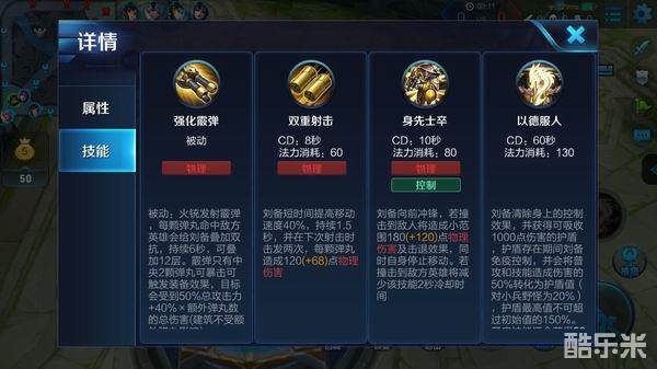强化霰弹:刘备的被动是在使用火统发射霰弹时,霰弹命中敌人时刘备自身则会增加双抗,并且中间两颗弹丸命中敌人时可触发暴击效果。这个被动大大的增加了刘备使用普攻所造成的伤害。