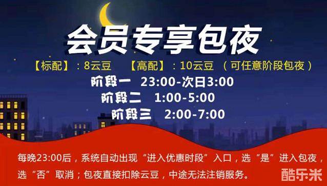 包夜模式为会员专用,非会员无法使用。每晚23:00后,系统自动出现“进入优惠时段”入口,选“是”进入包夜,选“否”取消,包夜直接扣除云豆,中途无法注销服务。