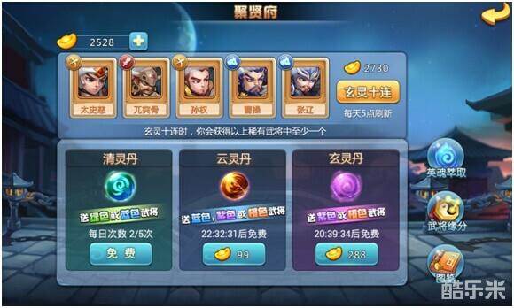 进入聚贤府界面的图标置于游戏界面的下方。聚贤府内的功能有:抽取武将、英魂萃取、武将缘分、图鉴。