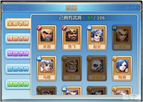 显示现有106种武将图样,当拥有该武将时,武将头像变亮,点击武将头像可查询武将初始信息。