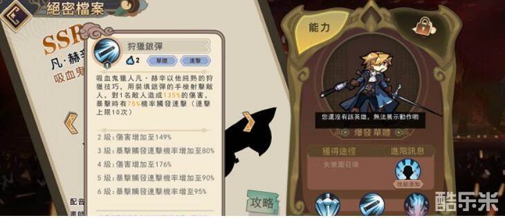 范海辛的普攻赐福的十字剑很平凡,单体攻击,不附加状态,没有什么好说的。小技能狩猎银弹就是范海辛最值得关注的技能,满级情况下暴击则高概率触发连击以及最高10次的超高伤害上限让其成为了不少玩家手中的搏命新星。