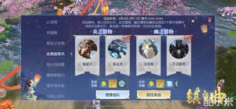 春满人间,花开如意,却有魔物肆虐。天命者们可叫上好友组队前往,每日10点、每小时30分时,在中州各地寻得这些魔物,只要击退它们即有丰厚奖励领取,若是遇到S级挑战更有海量福利送上,守护中州人们踏青平安。