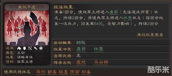 乘敌不虞:发动概率:35%,准备1回合,使敌军主将进入虚弱(无法造成伤害)状态,持续1回合,并使我军主将进入休整状态(每回合恢复一次兵力,回复率54% → 108%,受智力影响),持续2回合。
