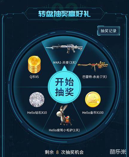 而重头戏是转盘抽奖的活动,奖池里面M4A1-天使,还有巴雷特-赤龙,最次最次也有Q币。咱是非酋没错,但就算手气不好,多抽几次难道还不中?运气好白嫖猛枪大半个月就起飞了,我算了下大奖全吃下大概是3天+3天+7天+7天+7天+5天,一共32天,扣除中间重复的,也能有个小三周的使用权,刺不刺激!