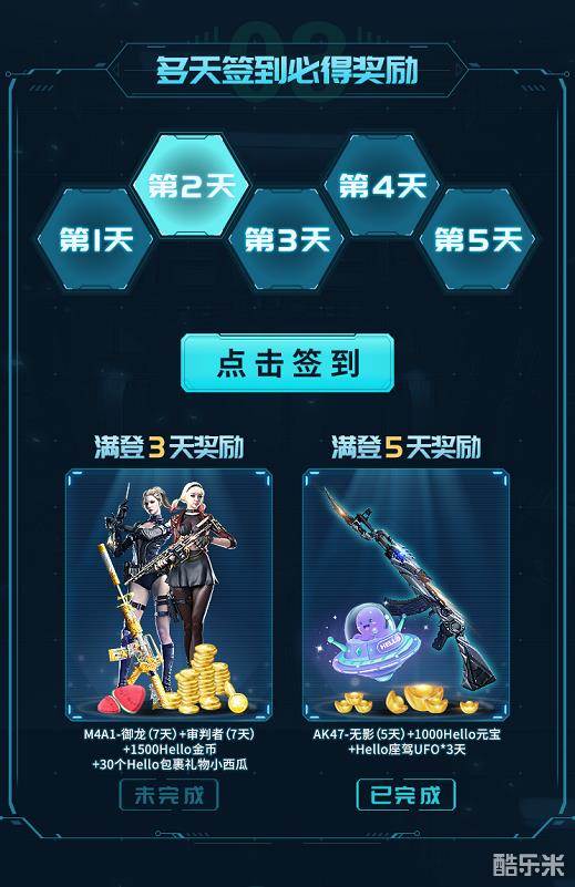除了抽奖白嫖以外,还有签到白嫖,这是实打实的,就算是终极非酋,也能爽到奖励。连续登陆三天就能得到M4A1-御龙,还有审判者以及一些hello语音得礼物。
