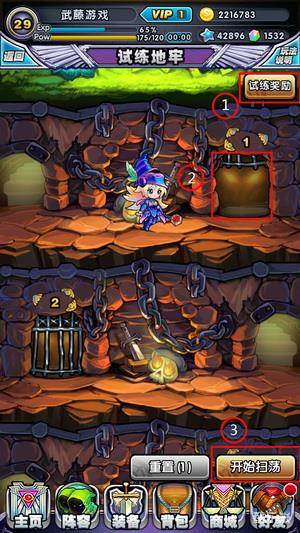 试炼地牢是一片神秘区域,地牢共有50层,层层都有人把守,击败守卫的召唤兽就可得到金币、星魂甚至星钻的奖励。每隔5层设置有高级BOSS击败后得到高级碎片、装备宝石等稀缺道具。