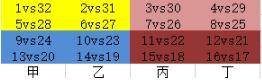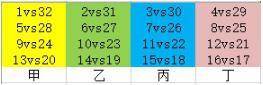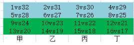 1、32强前16人每四人按顺序送入甲、乙、丙、丁四组擂台,对手1vs32这种顺序。如图