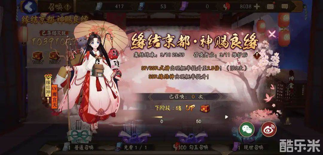 在3月11日维护前已达成SSR全集赏,本期缘结神指定出现概率将由初始15%持续提升,并在500次召唤后提升至100%;对于其他阴阳师们,本期指定出现概率将由初始的4%持续提升,并在500次召唤后提升至20%。