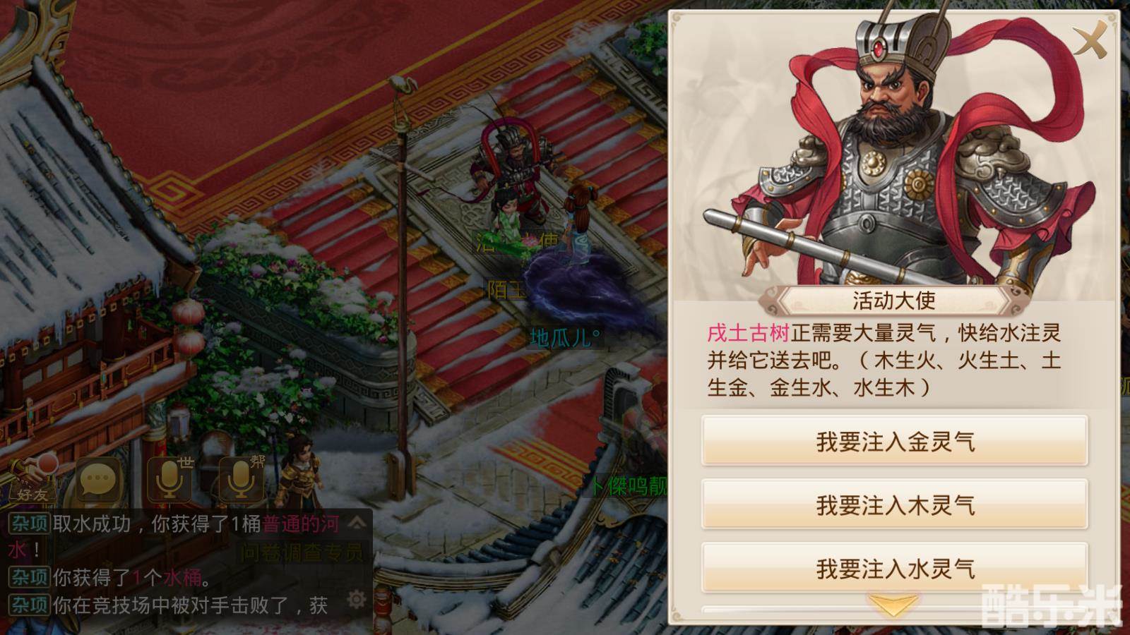 活动大使会先给予取水道具,然后道友们前往河流区域取水。之后,活动大使就会告诉道友需要灵气的古树是何种属性,根据五行相生的规则,选择需要注入的灵气即可。