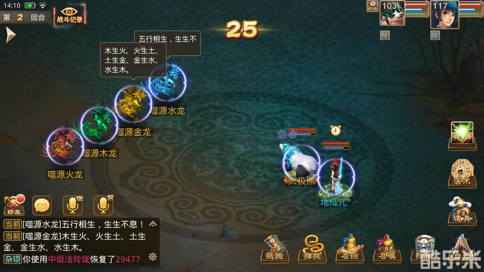 寻得妖魔位置,发现是五行噬源龙在作乱,进入战斗后会看见四条五行属性的噬源龙。此处战斗道友需要注意,五行噬源龙也是存在相生关系的,被攻击的噬源龙会给其相生属性的噬源龙治疗,并且此治疗能够复活目标。所以建议道友们在第一回合就要仔细观看缺少的是哪一种属性的噬源龙,并从此处入手,逐个击破,可以节省不少时间。