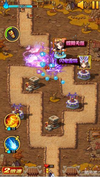 在游戏的闯关地图中,有各类不同的防御塔。目前游戏中的武将职业有弓手、炮手、法师和军师4类,他们分别对应的防御塔为弓箭塔、寒冰塔、唤雷塔、抛石塔。