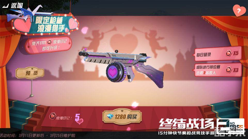 3月11日更新后至3月25日更新前,Thompson-浪漫猎手将限时回归终结战场,为情侣们提供最唯美的CP枪械:蓝色恋人与粉红知己。