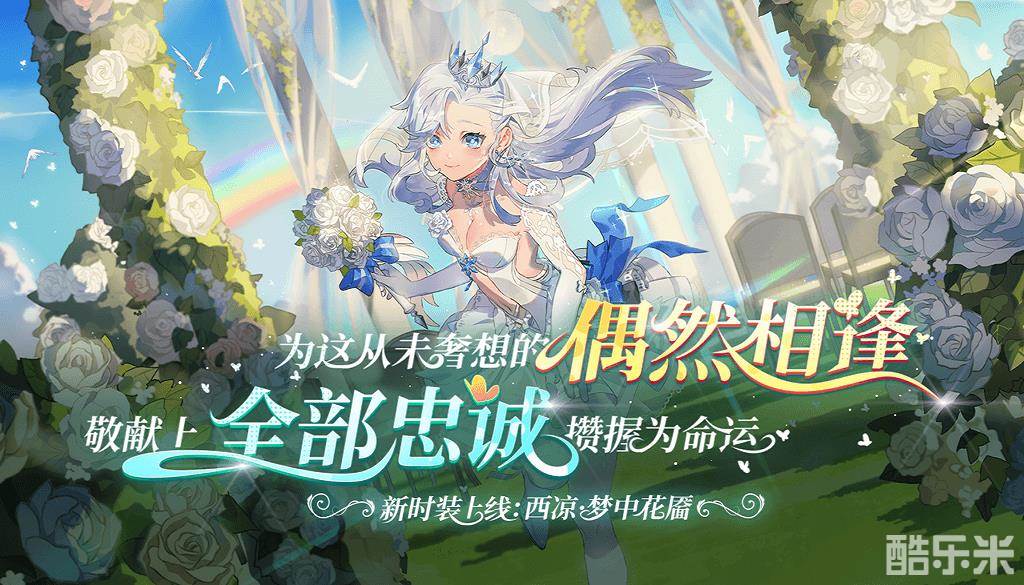 为了与你这从未奢想的偶然相逢,敬献上全部忠诚攒握为命运!明媚动人的脸庞,盈盈一握的纤腰,穿上了洁白婚纱的西凉,于往日的娇羞中更添惊艳。西凉的限定级时装【梦中花靥】,修身婚纱短裙装饰着蕾丝花纹,海蓝色缎带结成的蝴蝶结又增添了浪漫与梦幻,洁净如冰雪般纤尘不染。
