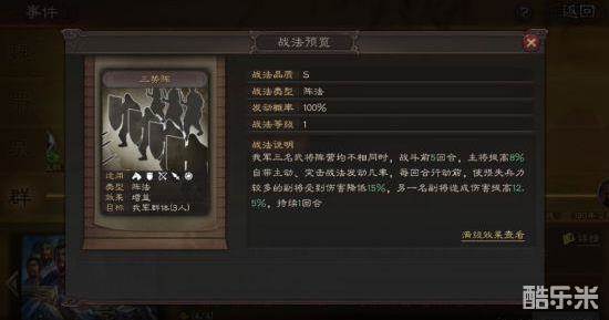 三势力阵来源于三赛季事件战法群雄讨董,需在袁绍、孙坚、马腾、公孙瓒、曹操、刘备这些武将中仍选四张卡进行兑换,单从消耗的武将武将数量来看,这个技能强度就不会很弱。