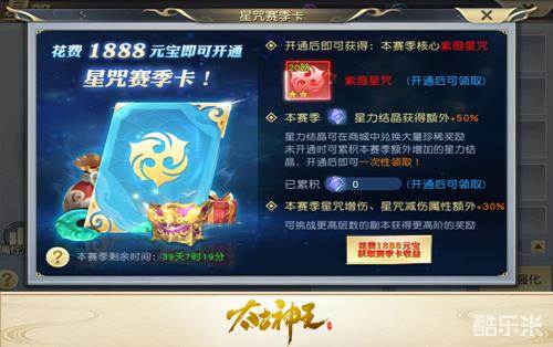 现在有了星咒赛季卡,开通后获得星力结晶额外+50%,还能立即获得本赛季红色核心、星咒属性加成BUFF。新赛季时立即开通可以大幅提升挑战效率,未开通也会正常积累额外结晶,开通后即可一次性领取。