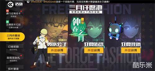 截止至4月2日24点,玩家可以参与“三月许愿池”活动,从时装-天才少年·特斯拉(奖励30个时装碎片可激活1星时装)、贴纸-重盾·仲春之月、饰品-重盾·金刚这三个奖励选择两个作为愿望免费获得。许下愿望后,玩家完成对应的活动任务即可积累愿望值兑换奖励。