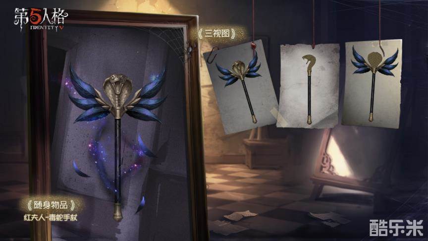 毒蛇手杖的外形则十分骇人——杖首是一只张开大口露出毒牙的眼镜蛇,六片紫色羽毛分居手杖两侧,即使是最令人恐惧的手杖,依然保持着女皇的优雅与高贵。使用毒蛇手杖后,红夫人在使用技能,放置水镜及分身换位时,都将伴有紫色幽光特效,紫芒萦绕着水镜和镜影,如梦似幻,浪漫迷离,却又隐藏着致命的危机。