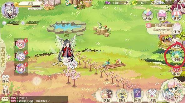 神树的位置就在界面的右侧,很容易找到哦,玩家们点击家园按钮换成冒险,然后点队伍图标之后点最左边的卡牌就能进入神祈界面了。