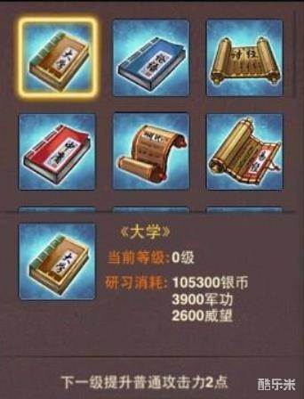 那么升级太子科技需要消耗什么呢,游戏中主要通过消耗银币、军功、威望及专注力。太子研习功课消耗资源的多少与太子当前的专注力有关,大于0时为一倍,小于等于0时为1.3至3倍不等噢!每项科技加的属性都不一样,所以玩家朋友要根据自己的实际情况及主将性能来选择升级,不要盲目升级,负责资源会严重浪费。