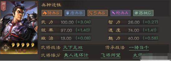 武将属性上,武力无双,但0.27的智力成长以及极低的基础智力值使得他在谋略输出为主的队伍面前,变得尤为小心翼翼。