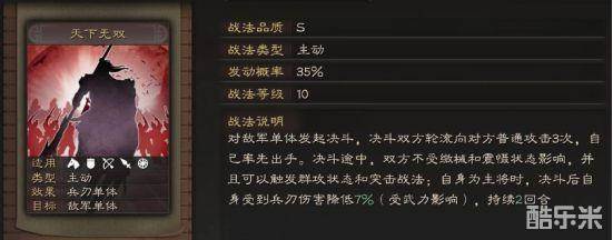 主动战法。对敌军单体发起决斗,决斗双方轮流向对方普通攻击3次,自己率先出手。决斗途中,双方不受缴械和震慑状态影响,并且可以触发群攻状态和突击战法;自身为主将时,决斗后自身受到的兵刃伤害降低7%(受武力影响),持续2回合。