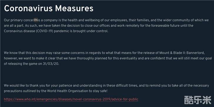 感谢大家在困难时期给与我们的耐心和理解。也希望全球所有玩家都能够按照世界卫生组织的要求来采取必要安全措施,对病毒进行有效防控。希望大家都能健康地玩到《骑马与砍杀2:领主》!