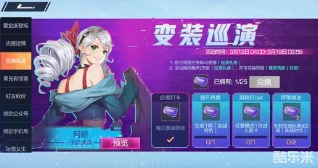 最近在举办一项变装巡演的活动,而积极参与活动达成任务即可获得巡演礼券道具。通过收集巡演礼券道具达到一定数量之后,即可兑换入手阿丽便装偶像时装。