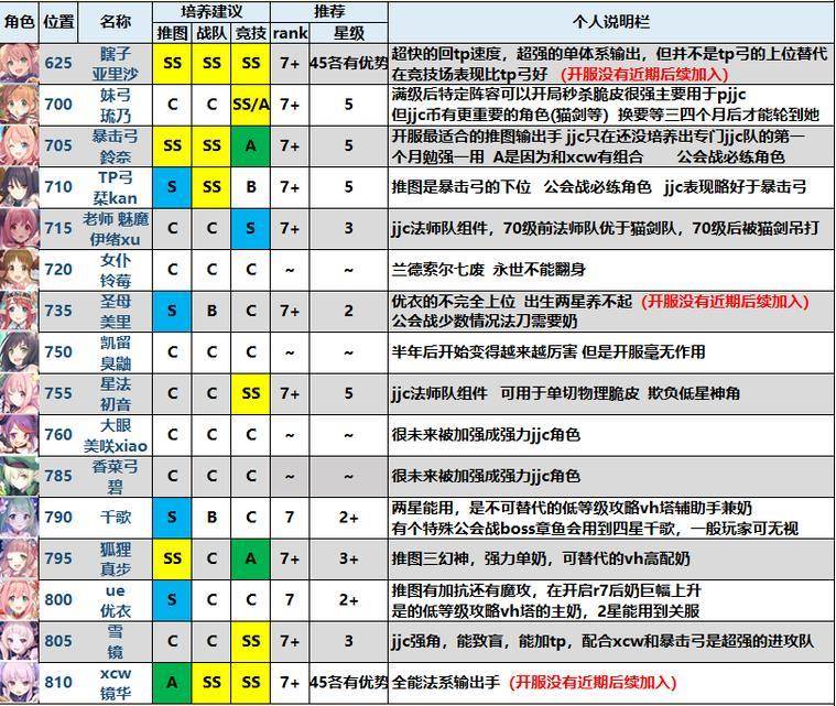 由于是国服落后的几个版本所以在这个表中只是介绍前三个月的一些角色,对于我们来说帮助应该已经有了,想要发挥出强大的战斗力的话,上面这个角色那些是不能缺少的,有些未来的强大的角色,可以先等到后续有了空余的时间或者体力再进行养成,加上因为落后这么多版本,如果版本到时候如果能够培养的话,进任何论坛基本上都会有很大的讨论的声音所以大家完全没有必要太过在意,还有一个角色上面是没有的,但是基本上都是一些限定角色,它的强度都是完全没问题,基本上只要有的话就要进行培养,希望大家能够在游戏中的前期掌握比较大的优势,只有这样才有可能,获得更多的奖励在PVP当中。