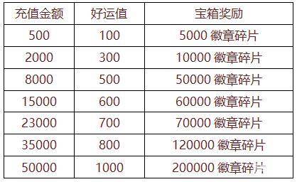 【活动内容】活动期间可通过充值金币获得好运值,积累好运值即可打开宝箱奖励,超多的徽章碎片,徽章等级不断攀升,绝对超值的提升战力资源,尽在特惠好礼。