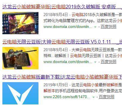 那么网上为什么那么多类似达龙云电脑破解版的信息呢?主要是一些相关下载站会把一些比较热门的软件客户端凡在他们的网站上,并取上破解版的标题和提供下载链接。当被搜索引擎收录后,玩家们通过相关关键字搜索就能搜到他们。