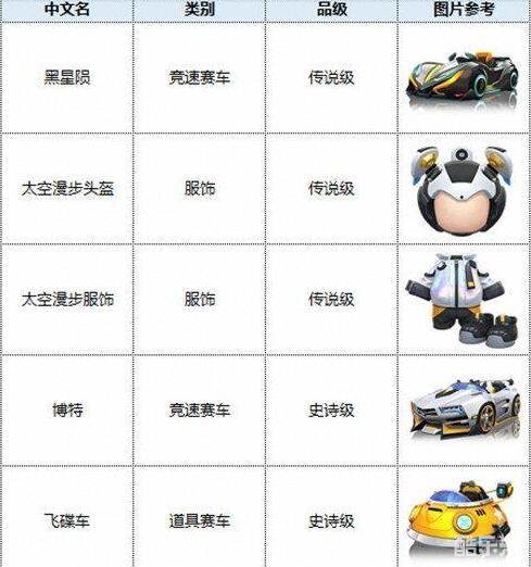车辆:传说级竞速赛车“黑星陨”,史诗级道具赛车“飞碟车”以及史诗级竞速赛车“博特”